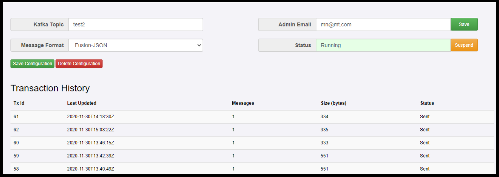 | tx_status | transaction status 0 Pending 1 Sent Sucessfully 2 Was not sent due to local failure, message did not leave Registry, typically message fails local checks with respect to connection settings 3 Sent and a notification of error received from Kafka server 4 Unexpected Registry error |