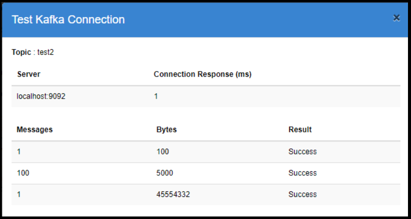 Note 1: the last test generates a large message (up to the number of bytes specified). As the message contains a lot of repeated text, the compression (if set) will make the final message size very small. If the intention is to also test the message size against the topic and kafka server, then ensure compression is set to none before running the test.