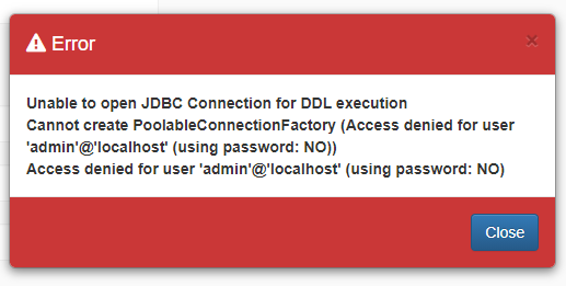Any problems Fusion Registry encounters connecting to the database service will result in an error message. The example below indicates that the user credentials are wrong.