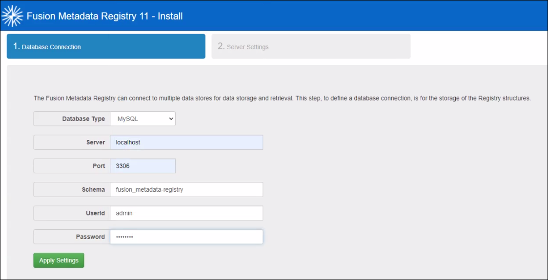 The Install Wizard is a two-page wizard that is shown for the first time when an unconfigured Fusion Metadata Registry is started. This page is only shown once and once all the appropriate information has been collected, it will not be displayed again, even if you upgrade FMR to a later version 11.