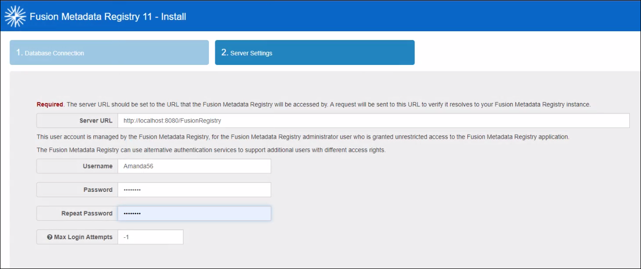 The Server URL is the fully-qualified URL which the Fusion Registry will be access by, and is used by FMR when it needs to communicate the URL to a user, for example on the web service builder. NOTE: It is very important that the Server URL is set to reflect the public URL that the FMR will be accessed by, as this will be used as the base URL for any redirects (such as login, logout).