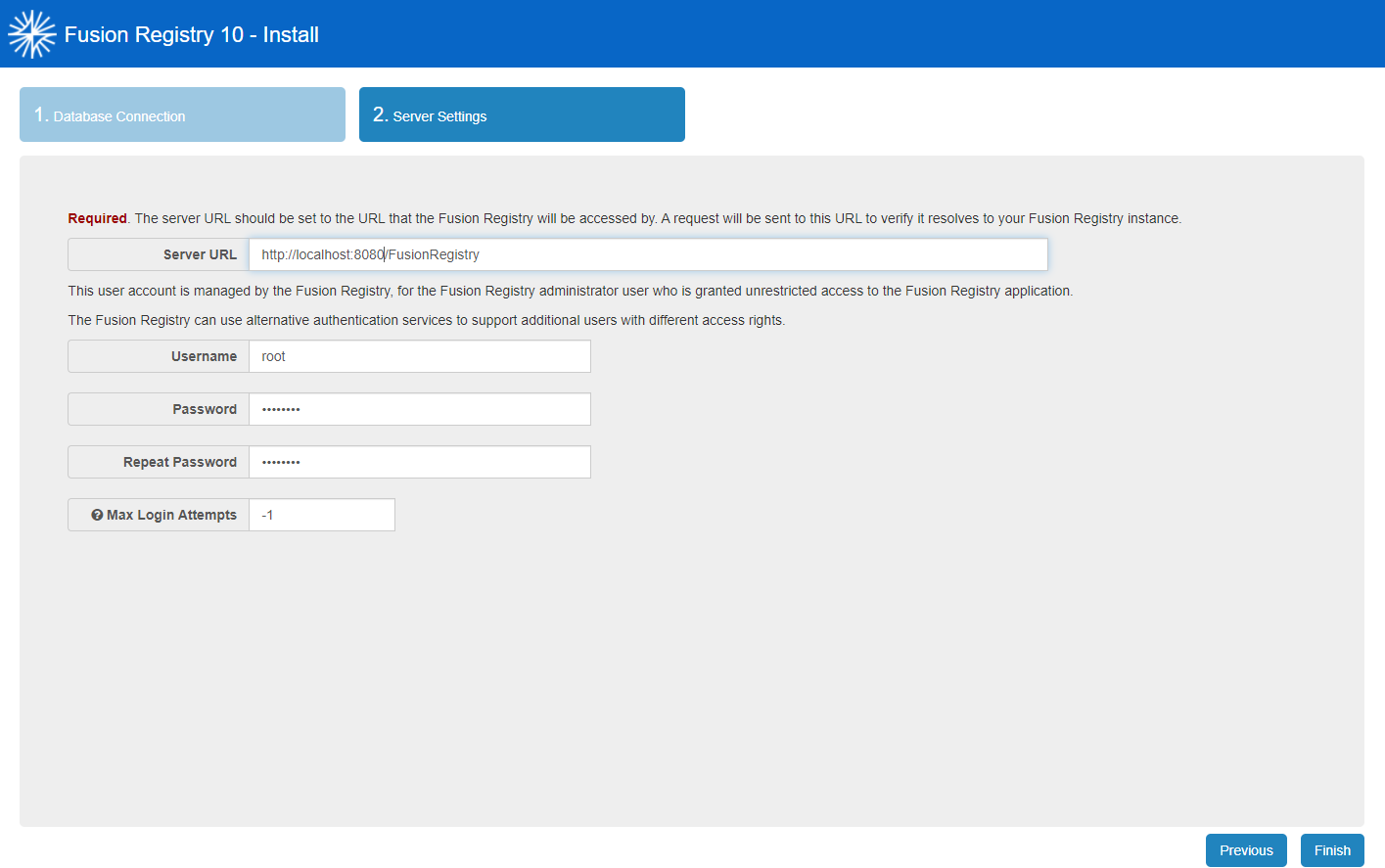 - Server URL is the URL on which Fusion Registry is operating. When running on a private machine, this can be set to