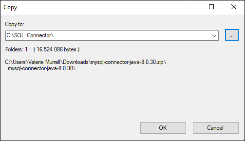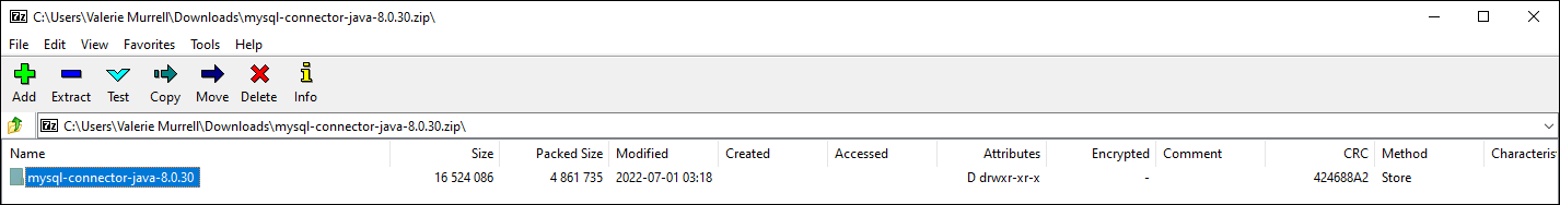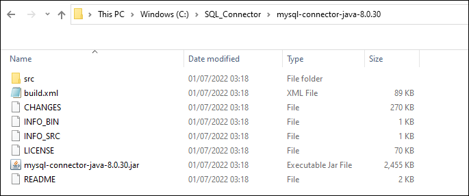 Make a note of the full location path (including the file name) for the 'jar' file, in this example: 'C:\SQL_Connector\mysql-connector-java-8.0.30\mysql-connector-java-8.0.30.jar'.