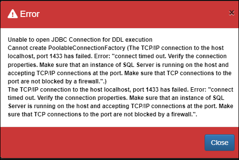 Any problems Fusion Metadata Registry encounters connecting to the database service will result in an error message. The example below indicates that the user credentials are wrong.