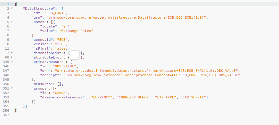 Fusion-JSON is a format used for Structural Metadata, Data, and Reference Metadata. The Fusion-JSON format was created before the SDMX-JSON format became a standard as so has a slightly different syntax. In addition the Fusion-JSON format is used for Structural Metadata that is supported by the Fusion Metadata Registry which is not a part of the official SDMX Specification. This includes: