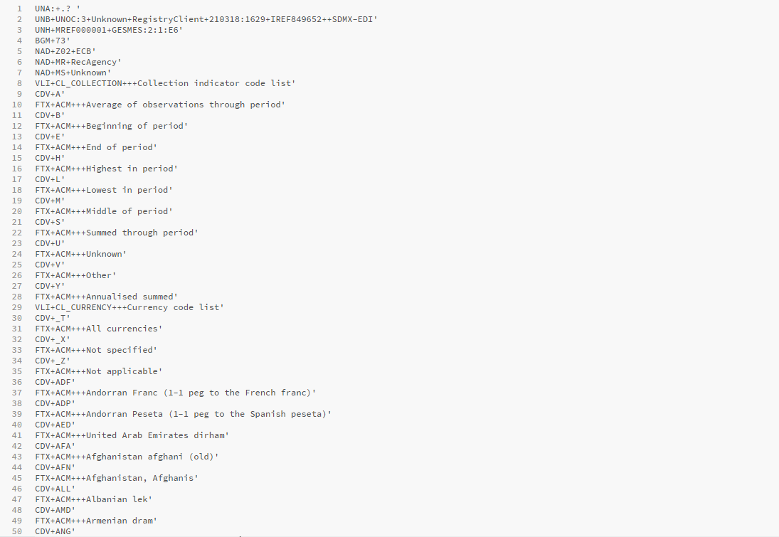 The SDMX-EDI Structure message is an official SDMX format used for transmission of structural metadata. It is a text based format, based on the the UN/EDIFACT syntax.
