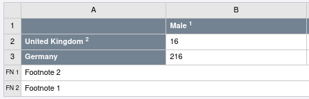 The Table Row Heading can be used to define a row level. The level indicates to the client responsible for rendering the table the row's position in a hierarchy. Row levels are depicted using one or more leading chevrons ‘>‘ before the text. The number of hyphens indicates the level, with one leading hypen indicating level 1, two indicating level 2, and so on. It is possible to skip levels if required, i.e. Row 1 is level 1 with Row 2 assigned to level 3, skipping out level 2 entirely.