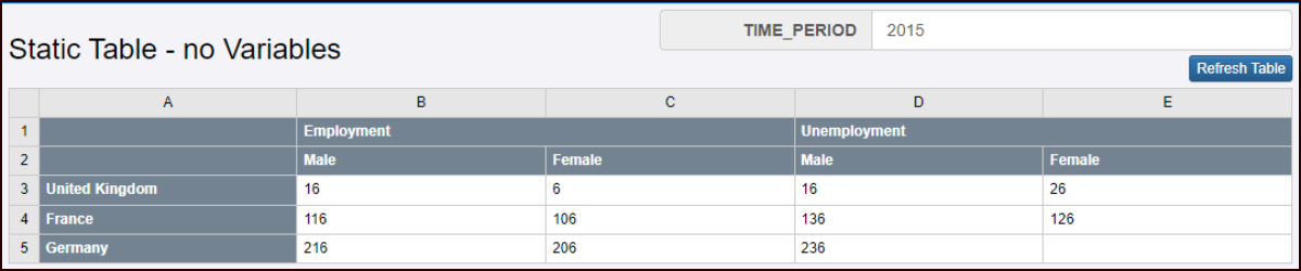 When an Observation Key has variable Dimension Values, the table will be built by replacing this variable with a value to complete the Observation Key. The variable value is either passed explicitly to the web service, or defaulted by the system if not provided. The Dimension Variable can be referenced in the table using the syntax $([dimension id]), for example: