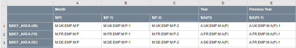 | A(P-n) | Base Period minus (or plus) 'n' periods, converted to another frequency 'A' | A:UK:EMP:A(P-4) | A:UK:EMP:2007 (base period=2008-Q4) |