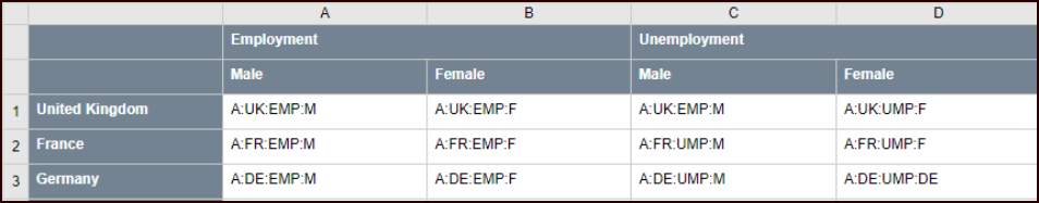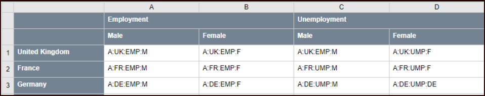 It is also possible to define a subset of the values to loop over. For example, if REF_AREA has data for 100 countries, but only 3 are required in the table. In this scenario, the natural order is that of the provided list, not of the underlying Codelist.