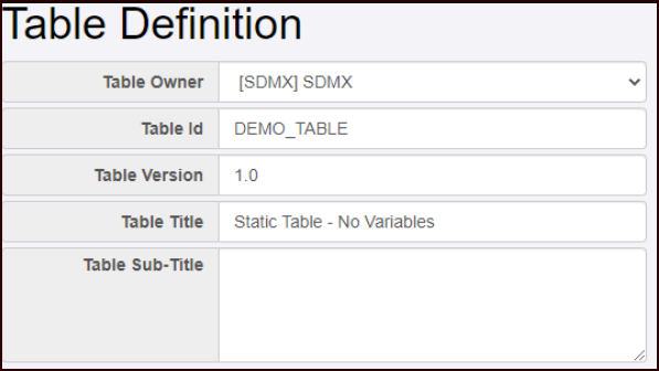 The Publication Table metadata contains information about which Dataflows are used by the Table, which additional variables are being imported, and a definition of the table structure, and which Observations to import by referencing them by their unique Observation Key.