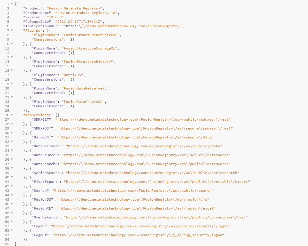 The Product Info web service can be used to obtain configuration details from a running Fusion Metadata Registry instance.