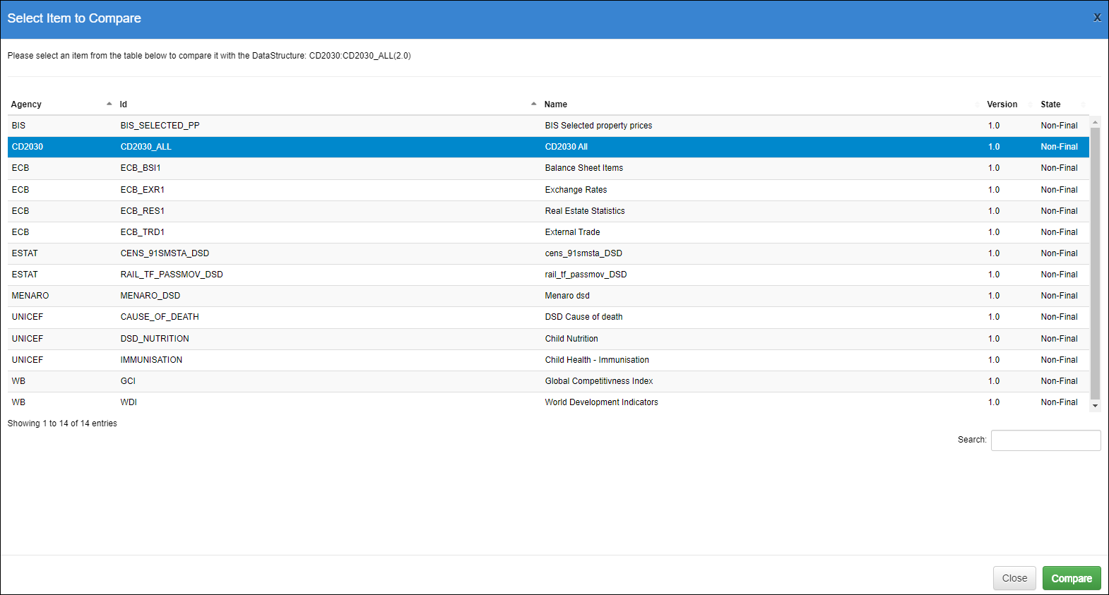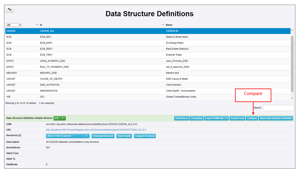 On Structure Overview pages, a Compare button allows you to copmpare one structure to another. An example of the DSD Overview page is shown below.