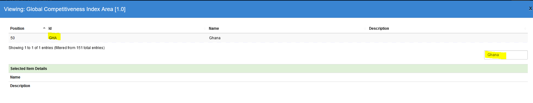 Again a link. If I click the link and View the codelist, I can enter the search term Ghana, to find the code that is used. GHA.