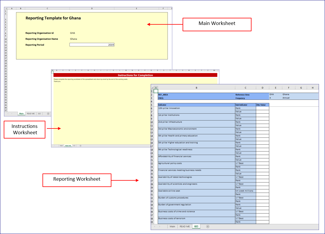 A Reporting Template definition is created in the Fusion Metadata Registry and describes the contents and layout of one Excel Workbook. Each workbook contains at least one worksheet which is backed by the Dataflow that the data collection is for. A workbook may contain multiple worksheets, enabling one Excel file to be used to submit data for multiple datasets.