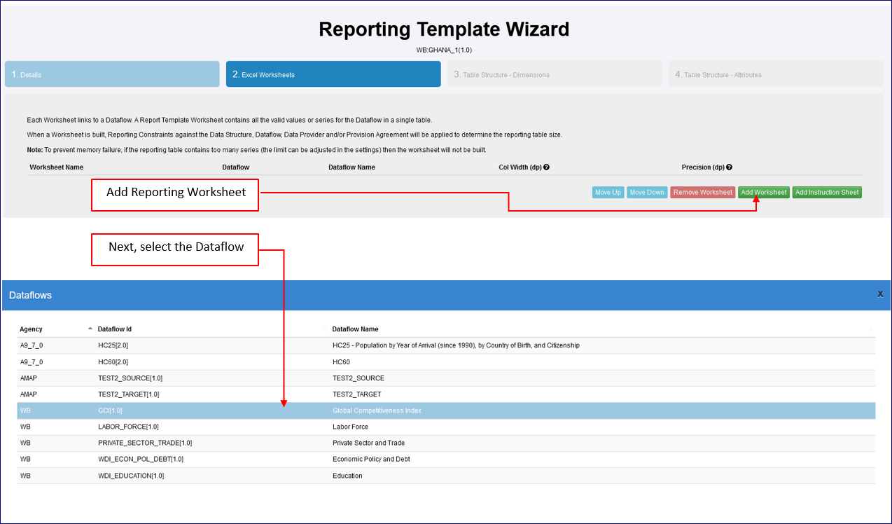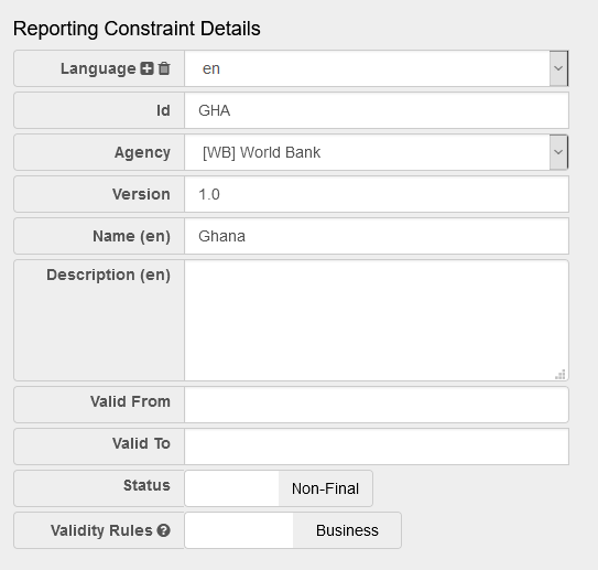 This example is a simple Template using the GUI and is for a scenario where the agency WB (World Bank) has a number of Data Providers (including one with the ID of GHA) who are reporting statistics against the Dataflow GCI (Global Competitive Index). The Data Provider GHA, is only permitted to report statistical data for Ghana.