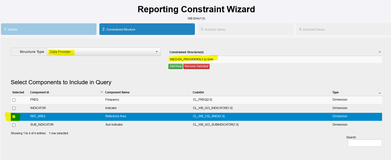 You will note that the Components of the underlying Data Structure are displayed and REF-AREA has been ticked. The codelist CL_WB_CGI_AREA contains all countries. The next step of the Wizard will allow us to define which Country.