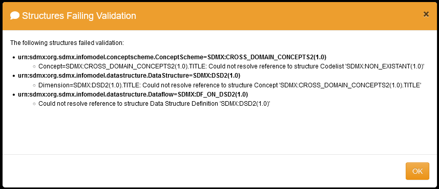 Please remember that the Registry enforces structural integrity and if a valid structure is invalidated by one of its descendants, it can not be loaded and will be deemed invalid. For example: a Dataflow that refers to a Data Structure that refers to a Concept Scheme which has an invalid reference (e.g. a Concept refers to a Codelist that does not exist), the Registry will prevent any of those structures being loaded. All failing structures would be listed in the validation report. This is illustrated in the example below, where a structure file was loaded which contains 2 Codelists, 3 Concept Schemes, 1 DataStructure and 1 Dataflow. One of the Concept Schemes references an invalid Codelist which is referenced by the DataStructure and Dataflow, thus these structures are not considered valid and can not be loaded until a change is made to the Concept Scheme with the invalid reference.