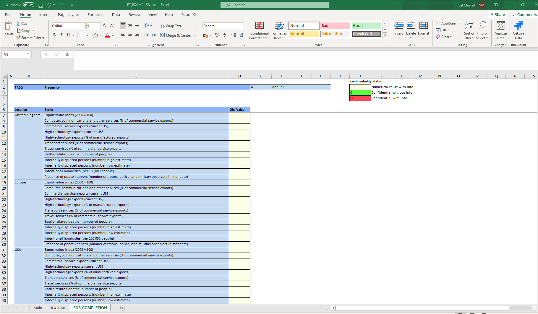 The Reporting Template is save and generated in the usual way. When the workbook is opened, you will seen 3 separate worksheets as well as the colour coding legend that was added in step 4.