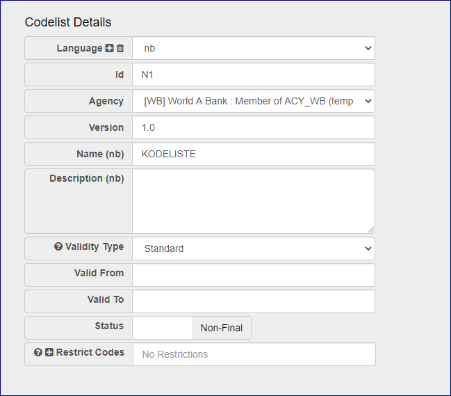 It is possible to create a Codelist which specifies a restriction on the code IDs that can be created within that Codelist. This is useful if you wish to ensure that the codes in your Codelist conform to a specific format.