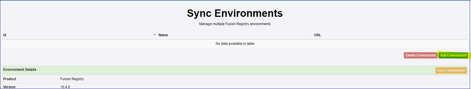 To create a new synchronisation target, first log into the Fusion Registry as a user with Admin privileges and click on the on the Environments menu item in the sidebar to open the page shown below.