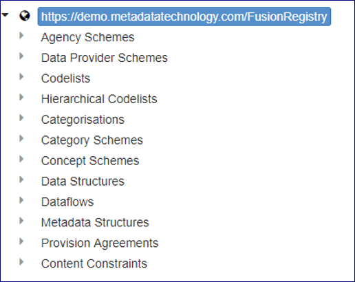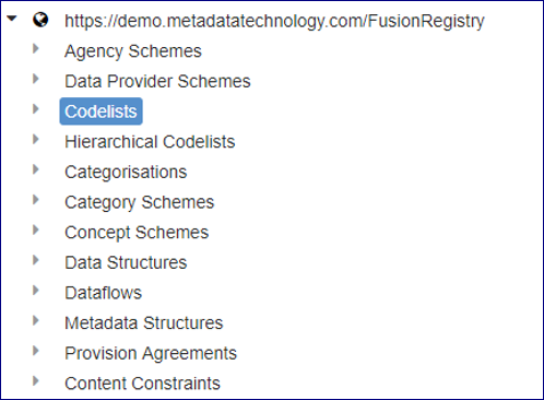 To perform a full sync on all structures of a specific type, click on the Structure Type in the hierarchy followed by Push or Pull as appropriate. In the example below, selecting Codelists at this level would Push or Pull all Codelists.