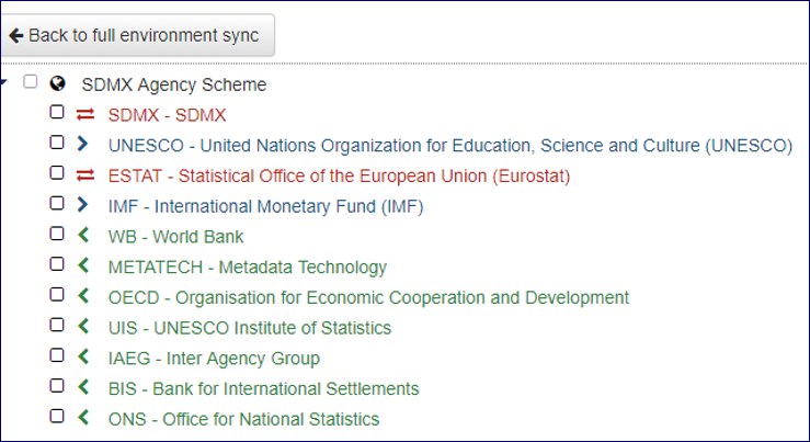 Conflicts are denoted by a double red arrow. This indicates that the structure exists in both the local environment and the target environment, but with differences in the structure’s content between the environments. A conflicting structure can be pushed to the target (overwrite the target’s version) or pulled to the local environment (overwrite the local version). For the case of item schemes (Codelists, Concepts, Agency Scheme, Data Provider Scheme, Data Consumer Scheme) individual items can be pulled or pushed, as explained in the following section.
