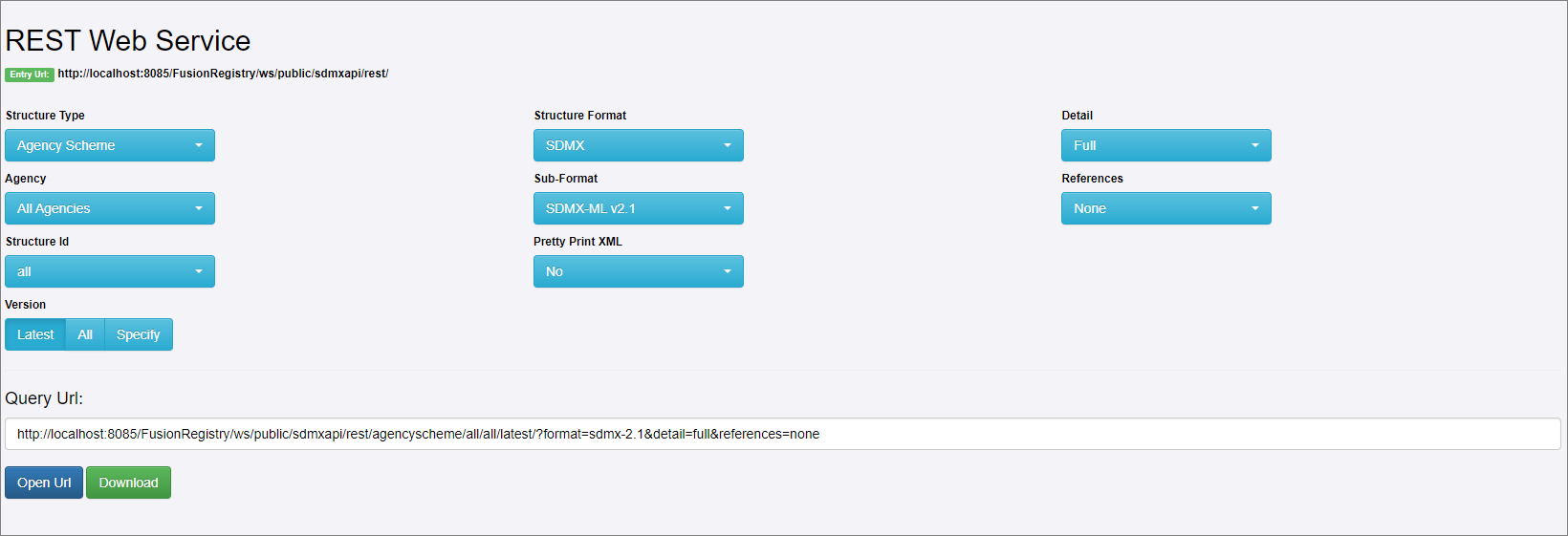 | Use this to obtain a number of versions as shown in the example which is a request for versions 1.0, 1.1 and 1.2 of a specific Codelist | http://localhost:8085/FusionRegistry/ws/public/sdmxapi/rest/codelist/MY_AGENCY/CL_AREAS/1.0+1.1+1.2/?format=sdmx-2.1&detail=full&references=none |