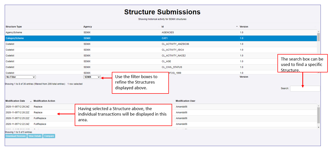 The Structure Submission option provides a breakdown of all the structural metadata content of the Registry (including any content that has been subsequently deleted). Each structure artefact can be viewed to see when it was modified over time, and each revision to the structure can be downloaded in SDMX format.