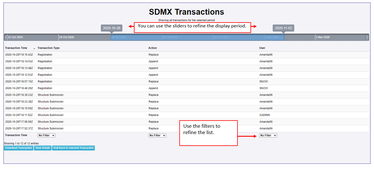 The SDMX Transactions provide a record of each transaction over time. A Transaction is the submission of a structure, group of structures or data registration. The submission may have resulted from the structure being modified in the UI or via the web service.
