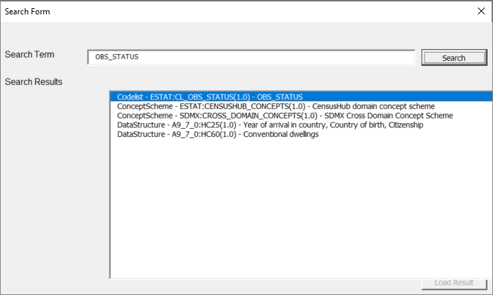 The Search Structure provides a free text search of Registry content. The search terms are applied to Ids, names, descriptions of all Registry structures. A search on OBS_STATUS for example will bring back the concept schemes that contain the OBS_STATUS concept, and Data Structure Definitions with dimension Ids of OBS_STATS, as shown below.