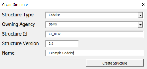 The Create Structure button opens window which enables you to select a structure type (please note that only Codelist, Category Schemes and Concepts schemes are functional in the current version of FXL).