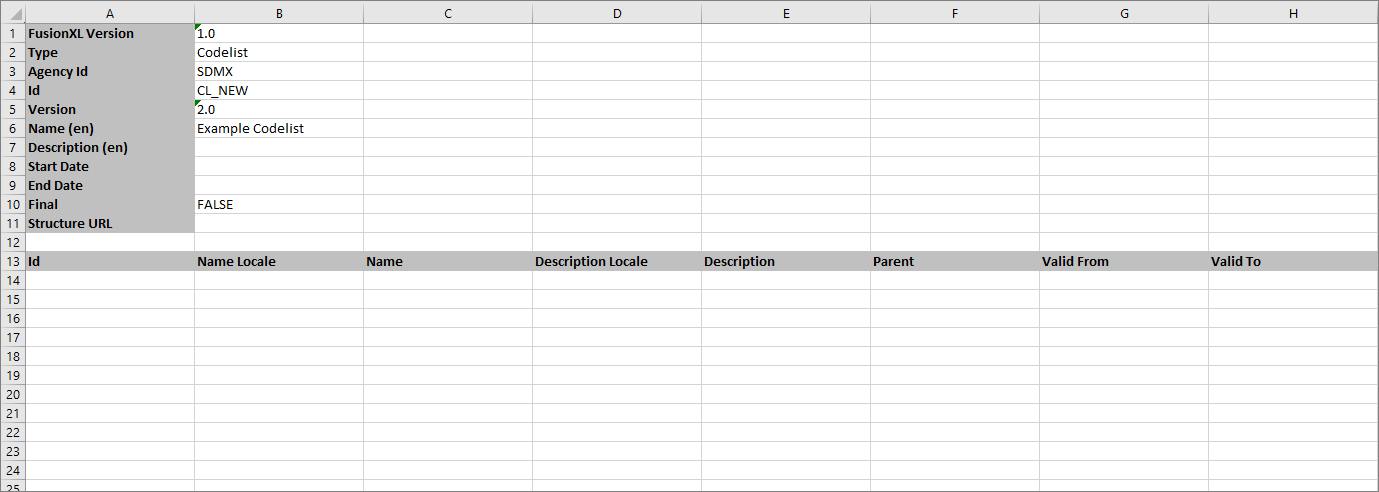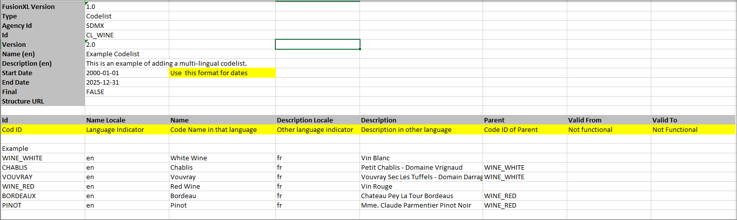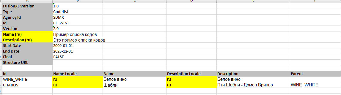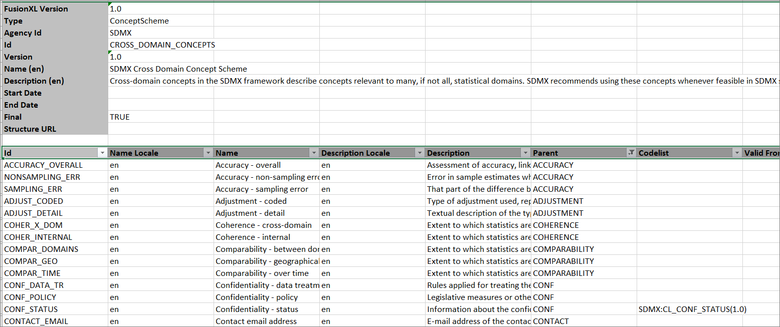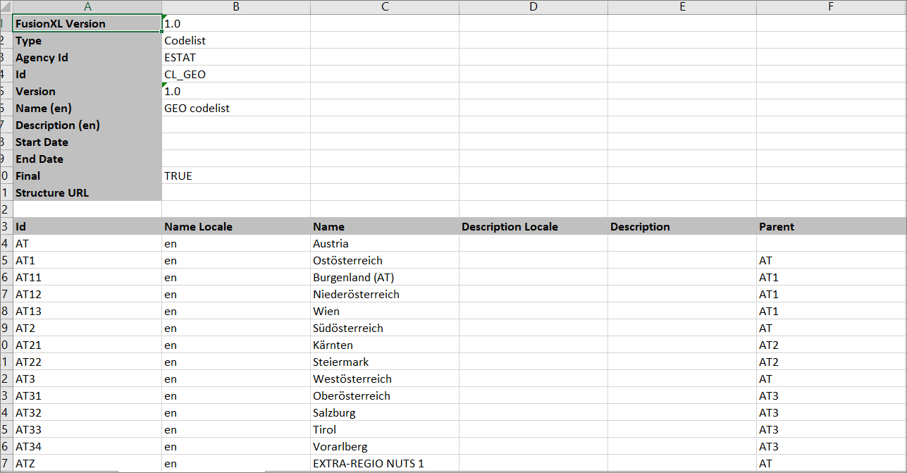 A Codelist can be represented as a hierarchy, but unlike a Category Scheme, the Code Id must not contain a period separator, and each Id must be unique. The parent code can be defined in the Parent column.