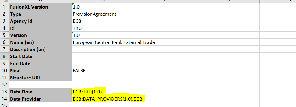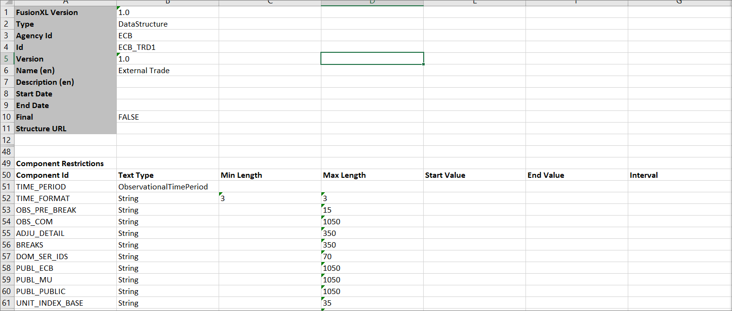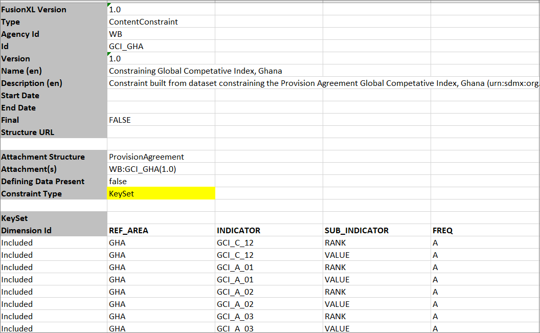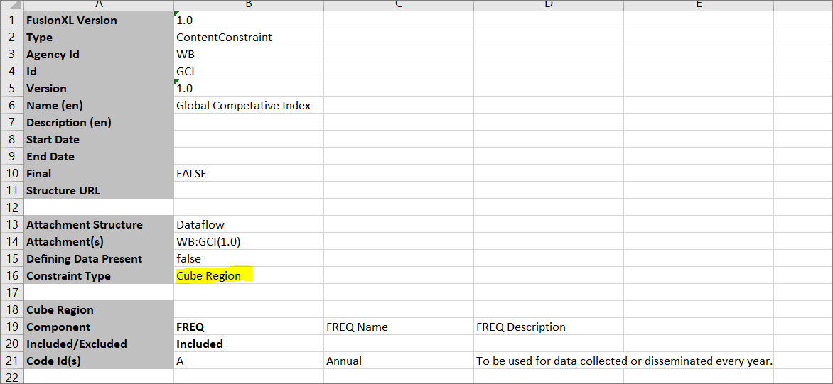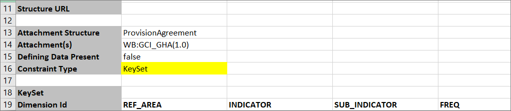 Row 18 onward are used to specify the constrained Series Keys or Code Ids, depending on the Constraint Type, these are described in the following sections.