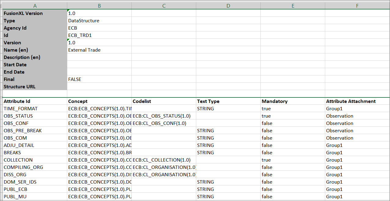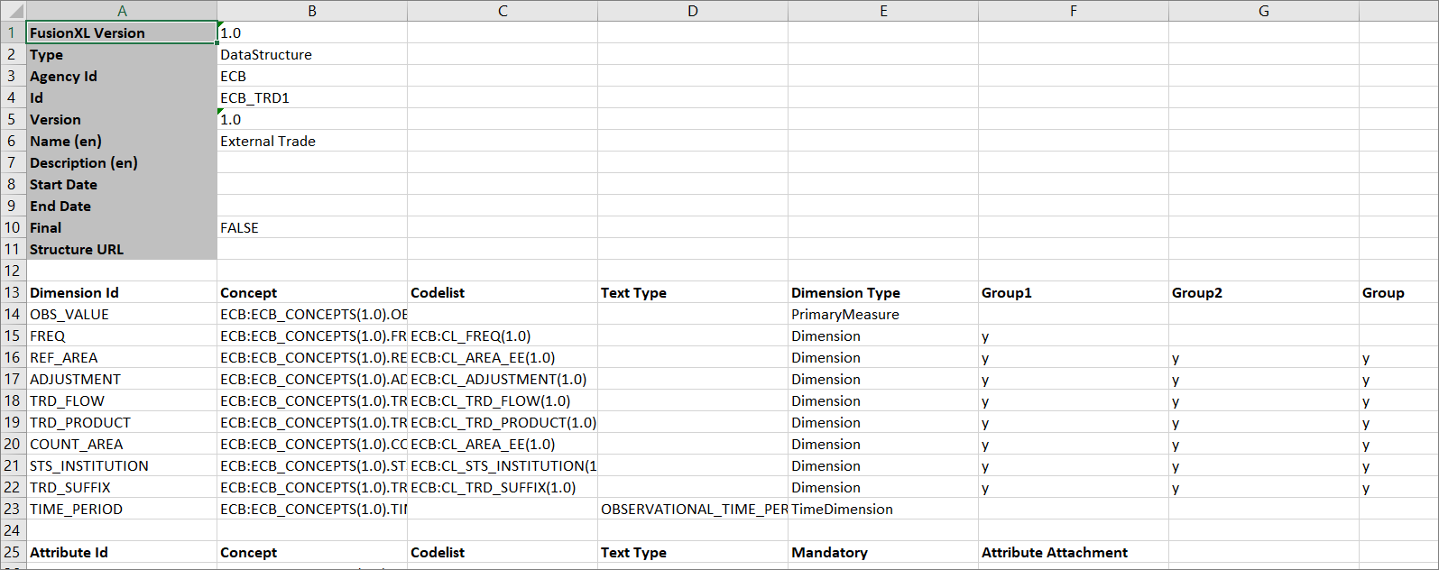 The columns F-G define dimension groupings, where dimensions included in the group are depicted by the relevant cell having the content ‘y’. The alias for each grouping is the column header, so in this example the groups ‘Group1’, ‘Group2’, and ‘Group3’ exist. Groups can be referenced by attributes, as described in the following section. If a group alias starts with the word ‘Group’ and is followed by a numerical value (e.g., ‘Group1’) then the generated attribute will reference all of the dimensions included in the group by Id (this is the equivalent SDMX attachment type of ‘Dimension Group’). If the group alias is anything else, then the generated Data Structure will include an explicit Group, with the id being set to the group alias. Any Dimensions that reference an explicit group will reference the Group by Id in the generated Data Structure Definition.