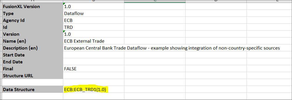 Fusion XL will open the retrieved structure in a new worksheet. Each Structure Type has a defined format in FusionXL, with the header information in rows 1 to 11, followed by the structure specific details. The example below is of a Data Structure.
